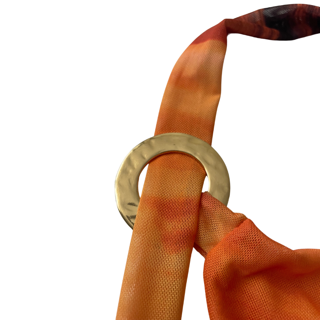- Halter strap loops into gold ring on top, works as tie closure